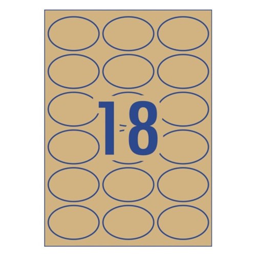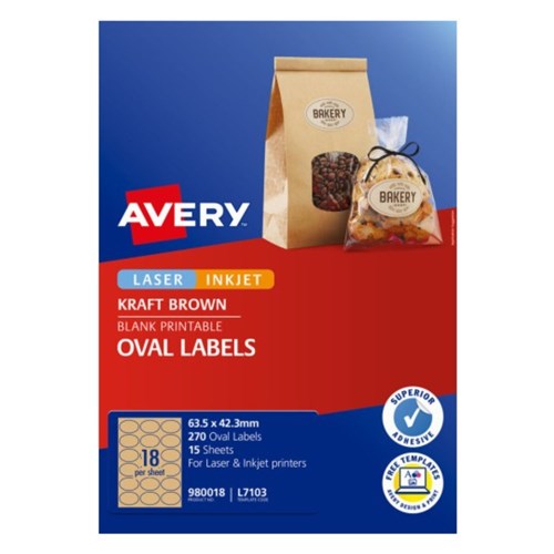 Avery Oval Labels 63.5 x 42.3mm L7103 Kraft Brown 270 Labels. Labels provide a natural look for showcasing your brand, logo or product. Made from 100% recycled material. Compatible with laser and inkjet printers.
