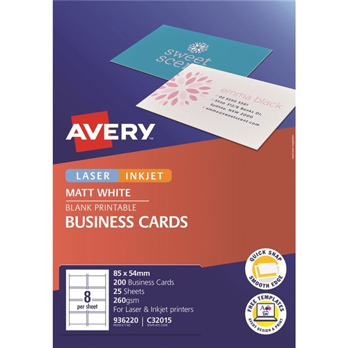 Design and print your own print shop quality business cards from your desktop. Easy to use with simple online software, to create professional looking heavyweight cards 85x54mm with perfectly smooth edges - no perforations and no card curl. Unique technology for easy and quick separation of cards - simply click apart when printed. Starter kit contains: Satin white 260gsm colour laser printable cards PLUS software with pre-designed templates. Supported by free Avery templates available at www.averyproducts.com.au/print. Size: 80x54mm 200 cards, 25 sheets. 8 cards per sheet (8UP).