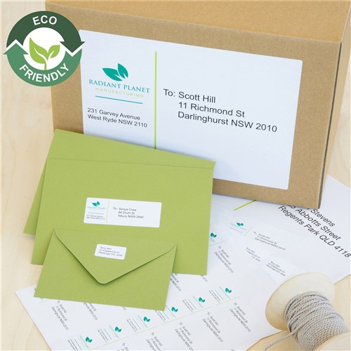 Environmentally friendly recycled material. Labels utilise water soluble eco-friendly adhesive. The packaging and label can be recycled. FSC certified labels made with paper from well-managed forests. This pack has 1300 labels in total, 65 UP, 20 Sheets.