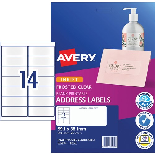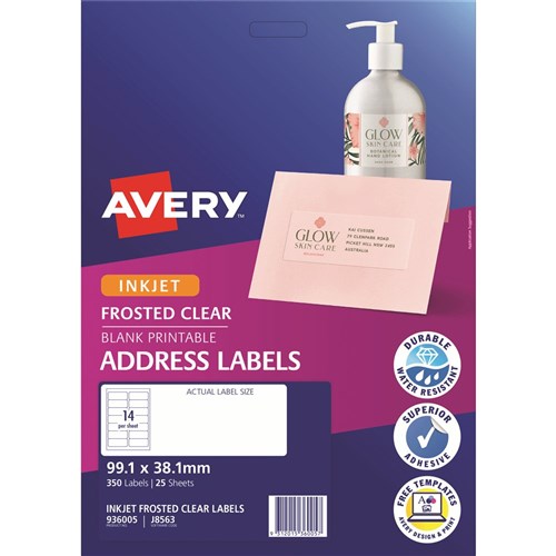 Avery Frosted Clear Inkjet Address Labels J8563 99.1x38.1mm 14UP 140 Labels 2324788 In Stock Low Stock Low Stock Please See Attributes