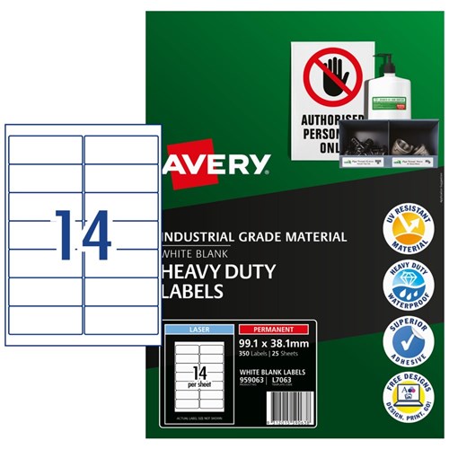 Heavy duty, waterproof, UV, oil and tear resistant unaffected by temperatures between -20°C to 80°C. Ideal for labelling equipment and organising property. Engineered to take on tough applications where a standard label is not fit for purpose. Customise your labels with Avery Design and Print, available at averyproducts.com.au/print. Made in Australia. Size: 99.1x38.1mm 350 labels, 25 sheets. 14 labels per sheet (14UP).