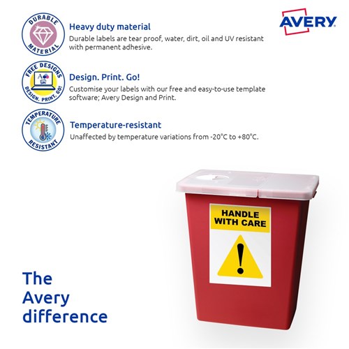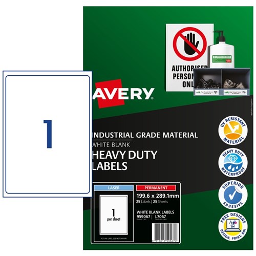 Heavy duty, waterproof, UV, oil and tear resistant unaffected by temperatures between -20°C to 80°C. Ideal for labelling equipment and organising property. Engineered to take on tough applications where a standard label is not fit for purpose. Customise your labels with Avery Design and Print, available at averyproducts.com.au/print. Made in Australia. Size: 199.6x289.1mm 25 labels, 25 sheets. 1 label per sheet (1UP).