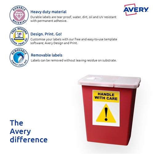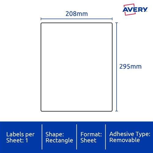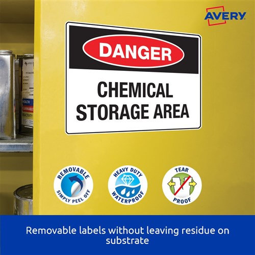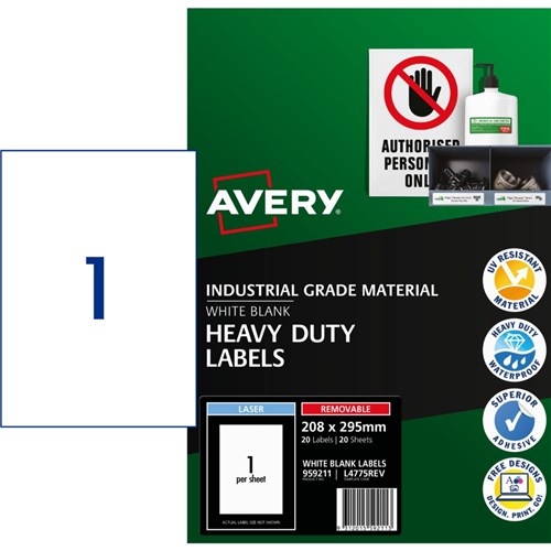 Weather, UV, oil and dirt resistant. Unaffected by temperature variations -20°C to +80°C. Removable adhesive formulated to adhere to a wide variety of surfaces without leaving residue. Ideal for creating temporary labelling of equipment, facilities and storage supplies, stock take and organising workshops. Customise your labels with Avery Design and Print, available at averyproducts.com.au/print. Size: 208x295mm 20 labels, 20 sheets. 1 labels per sheet (1UP).