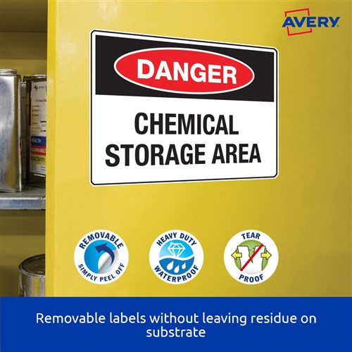 Weather, UV, oil and dirt resistant. Unaffected by temperature variations -20°C to +80°C. Removable adhesive formulated to adhere to a wide variety of surfaces without leaving residue. Ideal for creating temporary labelling of equipment, facilities and storage supplies, stock take and organising workshops. Customise your labels with Avery Design and Print, available at averyproducts.com.au/print. Size: 99.1x42.3mm 240 labels, 20 sheets. 12 labels per sheet (12UP).