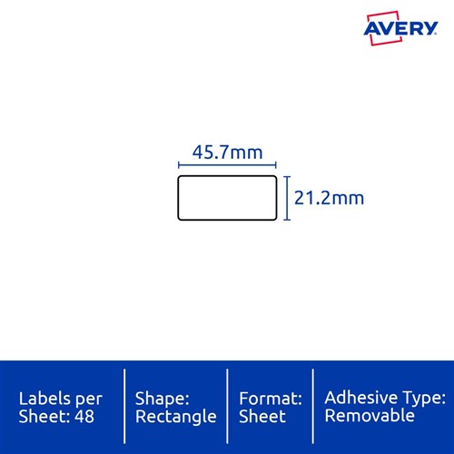 Weather, UV, oil and dirt resistant. Unaffected by temperature variations -20°C to +80°C. Removable adhesive formulated to adhere to a wide variety of surfaces without leaving residue. Ideal for creating temporary labelling of equipment, facilities and storage supplies, stock take and organising workshops. Customise your labels with Avery Design and Print, available at averyproducts.com.au/print. Size: 45.7x21.2mm 960 labels, 20 sheets. 48 labels per sheet (48UP).
