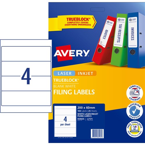 • Avery Filing Laser & Inkjet Labels White L7171 200x60mm 4UP 100 Labels 25 Sheets