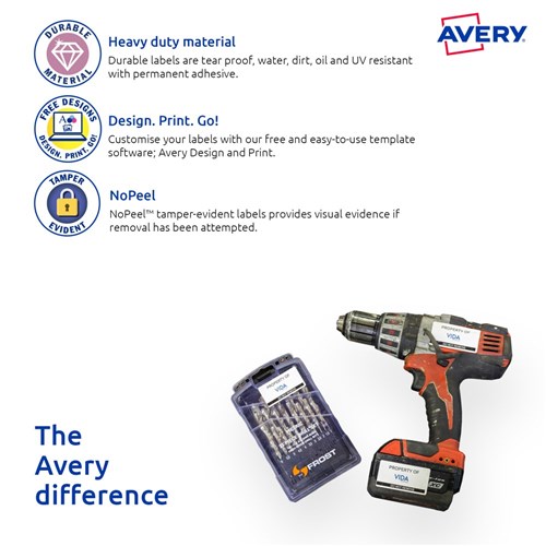 Tamper-evident security solution. If an attempt has been made to remove the label the material flakes and disintegrates, making removal virtually impossible and tampering immediately obvious. Durable labels are tear proof, water, dirt, oil and UV resistant. Unaffected by temperature variations -40°C to +100°C. Applications: for permanent tamper-evident asset labelling for computers, laptops, tablets, smartphones, computer screens, office equipment, tools and machinery. Customise your labels with Avery Design and Print, available at averyproducts.com.au/print. Size: 63.5x33.9mm 240 labels, 10 sheets. 24 labels per sheet (24UP).