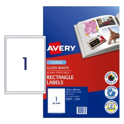Avery Printable Labels L7767 199.6x289.1mm Rectangle Photo Gloss White 1UP 25 Labels