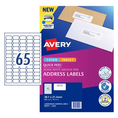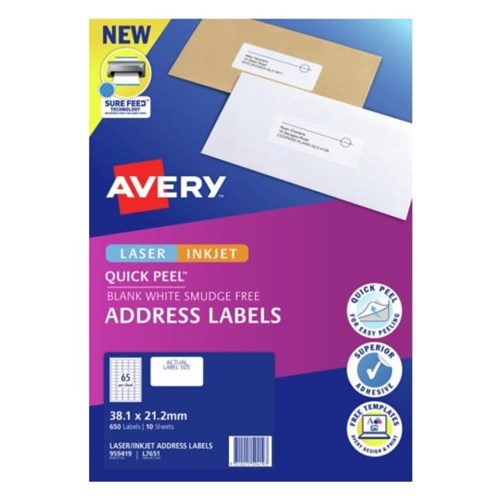 SureFeed™ technology is engineered to help provide a more reliable feed through your printer. Compatible with Laser and Inkjet printers. Address Labels have Quick Peel™ Pop-up Edge™ making peeling the label faster and easier, simply bend back the sheet and the edge pops up, just peel and apply 12-65 up. Jam-Free reliability for trouble free printing, saving time and minimising wastage. Labels use Opaque TrueBlock® technology which completely covers everything underneath. Customise your labels with Avery Design and Print, available at averyproducts.com.au/print. FSC® certified labels made with paper from well-managed forests. Made in Australia. Size: 38.1x21.2mm 650 labels, 10 Sheets. 65 labels per sheet (65UP).