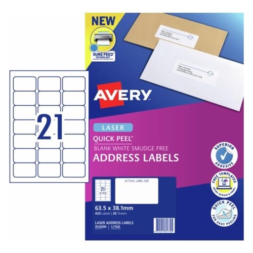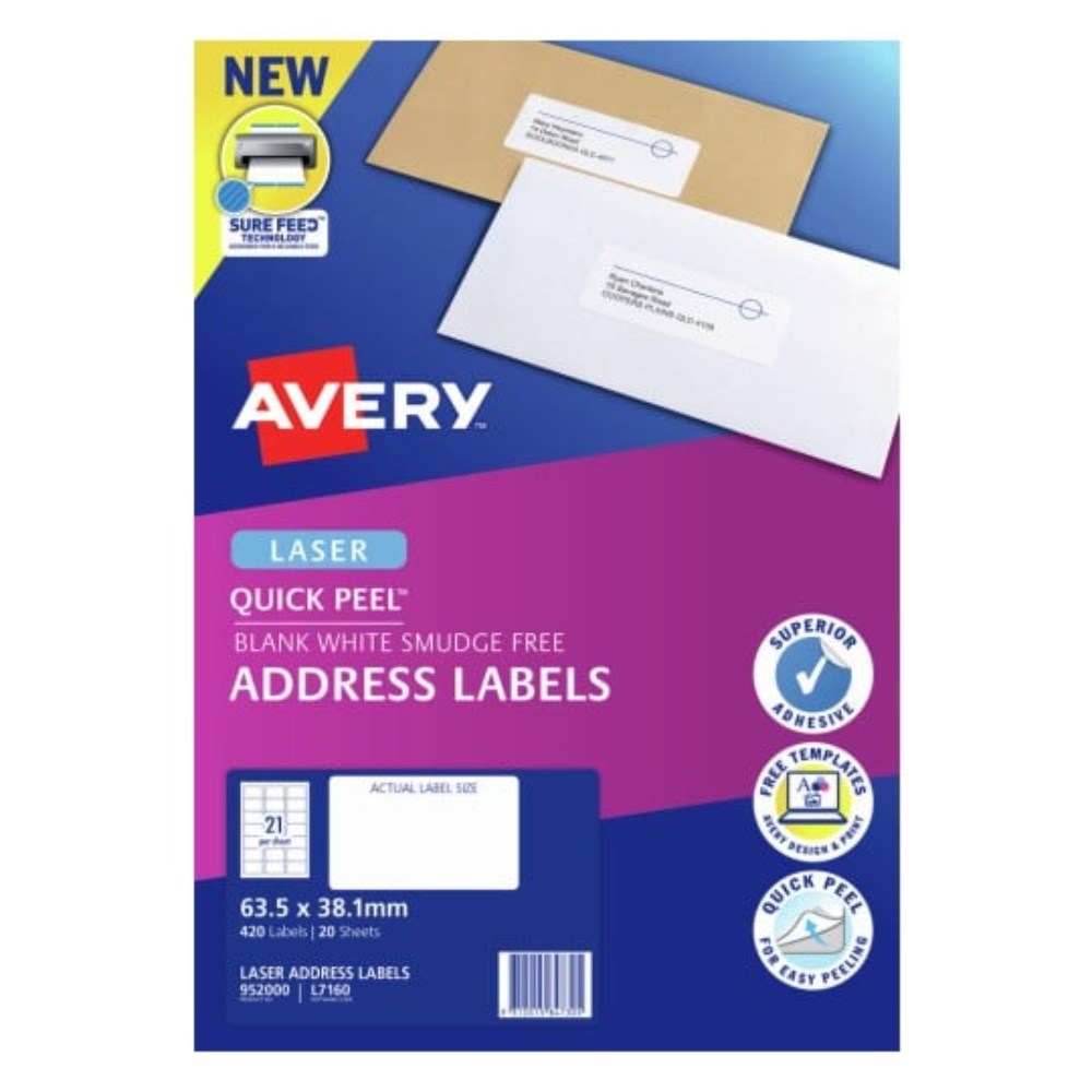 • Avery Quick Peel Address Laser Labels White L7160 63.5x38.1mm 21UP 420 Labels 20 Sheets