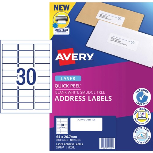 • Avery Quick Peel Address Laser White L7158 64x26.7mm 30UP 3000 Labels 100 Sheets