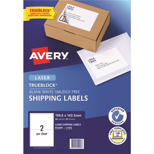 • Avery Shipping Laser Labels White L7168 199.6x143.5mm 2UP 50 Labels 25 Sheets