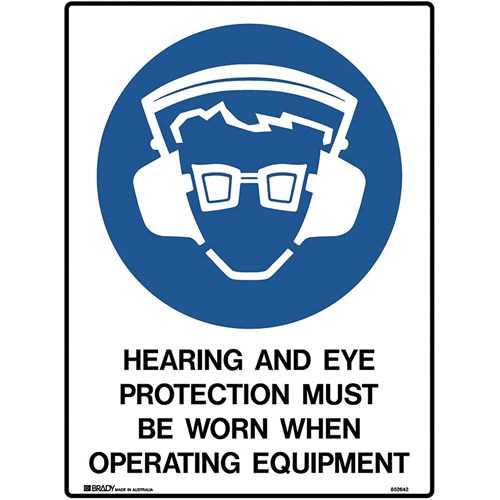 Wording: Hearing And Eye Protection Must Be Worn When Operating Equipment. Material: Metal. Mandatory signs specify an instruction that must be carried out. Complies with AS 1319. Available in various materials and sizes. Size: 450W x 600mmH.
