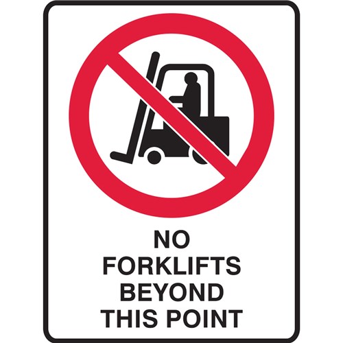 Wording: No Forklifts Beyond This Point. Colour: White, red and black. Material: Polypropylene. Prohibition signs specify behaviour or actions which are not permitted. Commonly found in offices, shopping centres and high traffic locations where specific actions could be potentially dangerous. Assists in communicating a message where there may be a worker or visitor with a language barrier. Size: 450W x 600mmH.