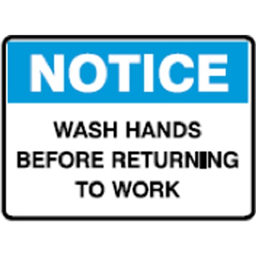 White, blue and black. Wording: Notice Sign Wash Hands Before Returning To Work. Material: Polypropylene. Size: 600W x 450mmH.