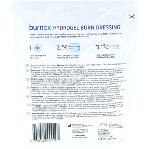 Burnex burn hydrogel is first aid burn treatment and can be used for minor burns, scalds and sunburn. Cools, soothes and helps relieve pain. Water soluble transparent hydrogel that does not disguise the extent of the burn, and can be readily rinsed off should further treatment be necessary. Helps prevent contamination. Off white/translucent gel impregnated into a white foam. Health Warning: Always read the label and follow the directions for use. Warning: For first aid treatment of burns up to 2 hours. Seek medical attention if burn is severe or covers a large area. Do not use if pouch is damaged. For severe burns seek medical attention. Store below 30 degrees Celsius.