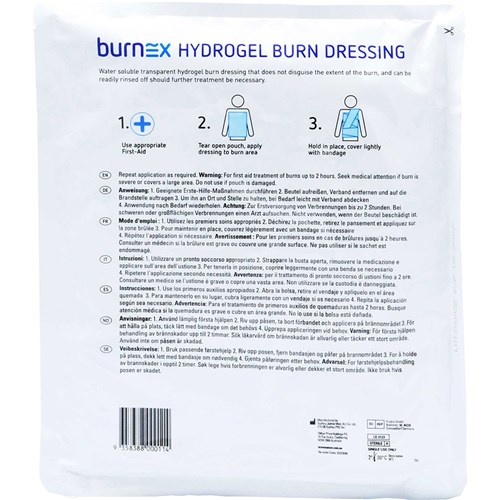 Burnex burn hydrogel is first aid burn treatment and can be used for minor burns, scalds and sunburn. Cools, soothes and helps relieve pain. Water soluble transparent hydrogel that does not disguise the extent of the burn, and can be readily rinsed off should further treatment be necessary. Helps prevent contamination. Off white/translucent gel impregnated into a white foam. Health Warning: Always read the label and follow the directions for use. Warning: For first aid treatment of burns up to 2 hours. Seek medical attention if burn is severe or covers a large area. Do not use if pouch is damaged. For severe burns seek medical attention. Store below 30 degrees Celsius.