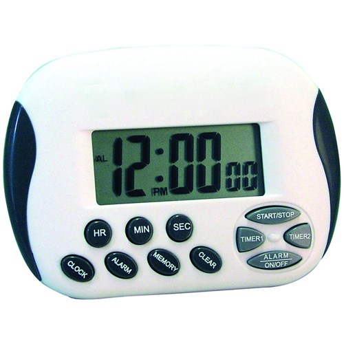 Clock function with am and pm identification. Time function can be easily set on/off. Uses 1x AAA battery (not included). Two timers allowing you to time 2 things simultaneously Timers are count up or count down with 1 minute 'times up' beeping sound. Memory function. Hour, minute and seconds buttons for timer setting. Able to self stand, hang, clip and has a magnet. 1 Year Manufacturer's Warranty.