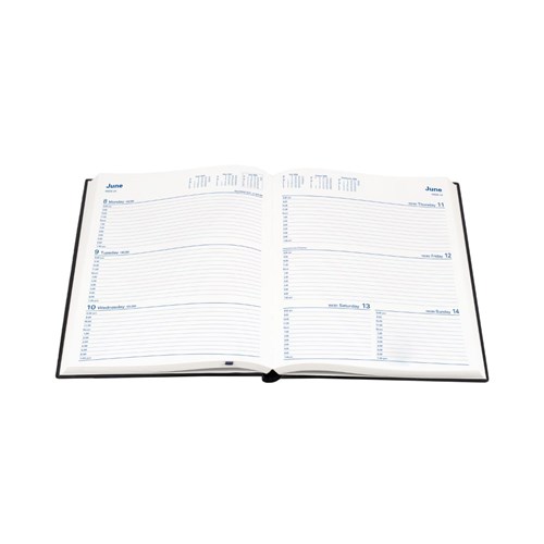 Bound in a highly durable, welded PVC padded cover. Printed on white paper, week numbers, Julian days. Features ribbon marker week to view layout. Appointment times from 8am - 7pm hourly. Australian and New Zealand Holidays. 3 year calendars. Current and forward year planners. International dialling and time zones. Staff leave planner. Addresses and notes. Size: 260 x 210mm. FSC Certified.