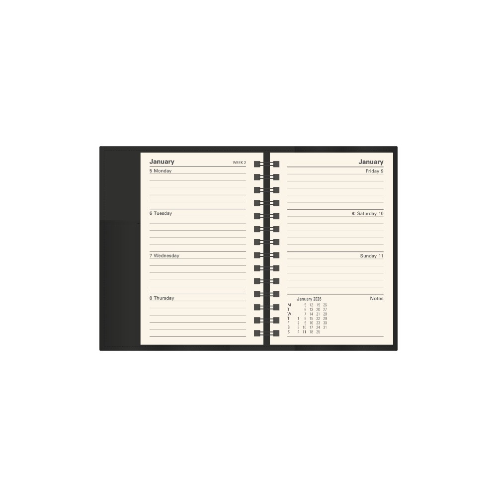 • Printed on a subtle cream paper, each dated page layout features a six-month to opening calendar, week numbers, Julian days, as well as both national and international public holidays.