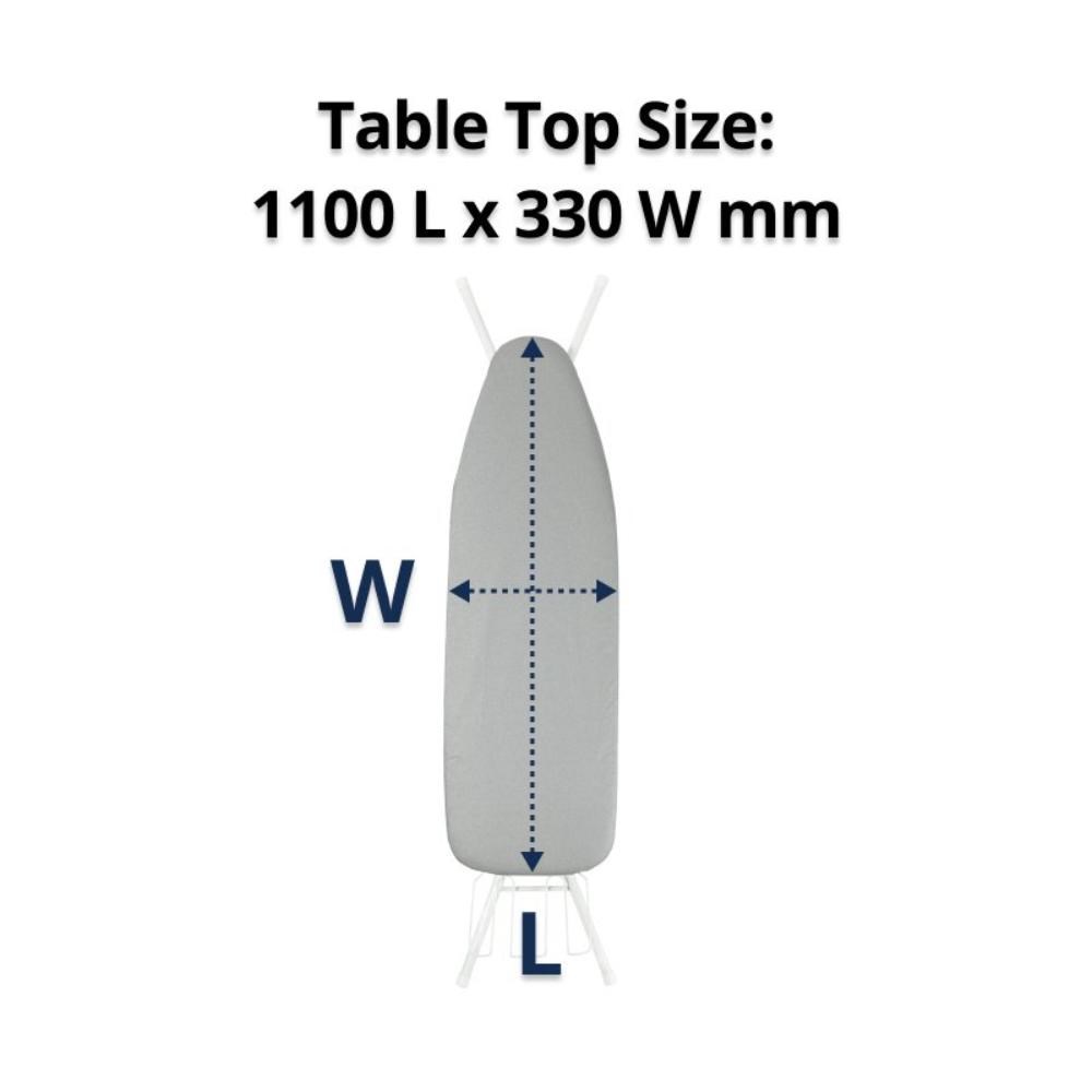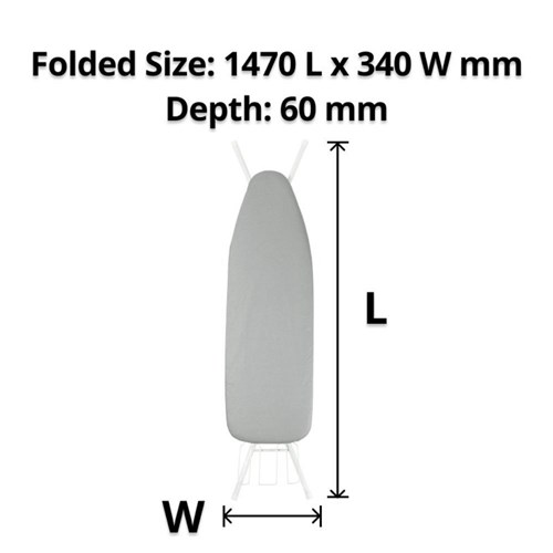 Complete with silver cover and iron caddy. Folded size: 1470L x 340D x 60mmH. Table top size: 1100 x 330mmW. Open height: 900mm. Leg tube diameter: 22mm. Board thickness: 30mm. Weight: 3.7kg.