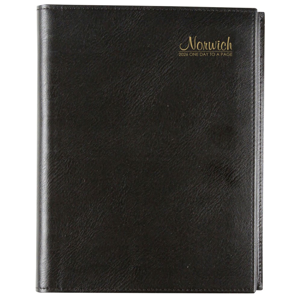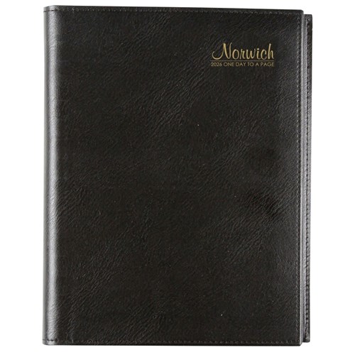 Featuring a stylish flexible leather grain cover finished with the famous gold foil 'Norwich' logo, stitched edges and fine ivory paper. Spiral bound. Deluxe pocket inside the front cover, perfect for holding your receipts. Day to page layout diary to keep track of appointments, meetings, and other important events. 15 minute appointment times 7:300am - 7pm, Monday to Sunday. 3 year reference calendars. Weights and measurements. Current and forward year planners. Australian and New Zealand holidays and term dates. Includes a ribbon bookmarker to mark significant dates, events, or entries within the diary. Includes a ribbon bookmarker to mark significant dates, events, or entries within the diary. 70gsm paper. FSC Certified.