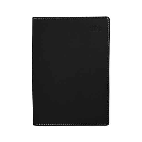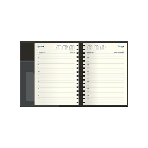 Soft-touch padded cover. Lay flat wiro binding with ribbon marker. Document pocket and business card sleeve. Appointment times from 7am - 8pm hourly. Australian and New Zealand holidays. 3 year calendars. Current and forward year planners. International holidays, dialling and time zones. Staff Leave planner. Addresses and notes. Size: 210 x 148mm. FSC Certified.
