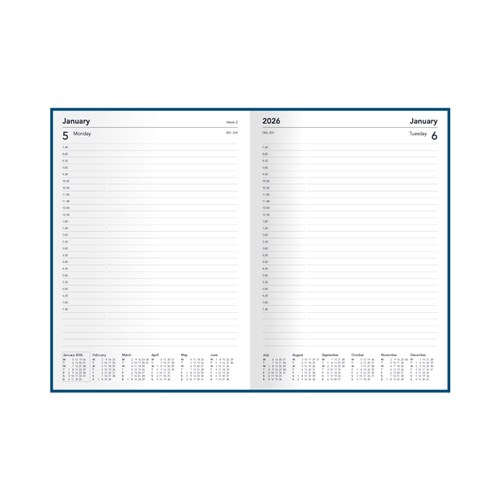 Soft touch padded cover. Ribbon marker. Appointment times 7:30am - 7:30pm, 1/2 hourly. 3 year calendars. Current and forward year planners. Financial summary. International holidays. International dialling. Size: 297 x 210mm. FSC Certified.