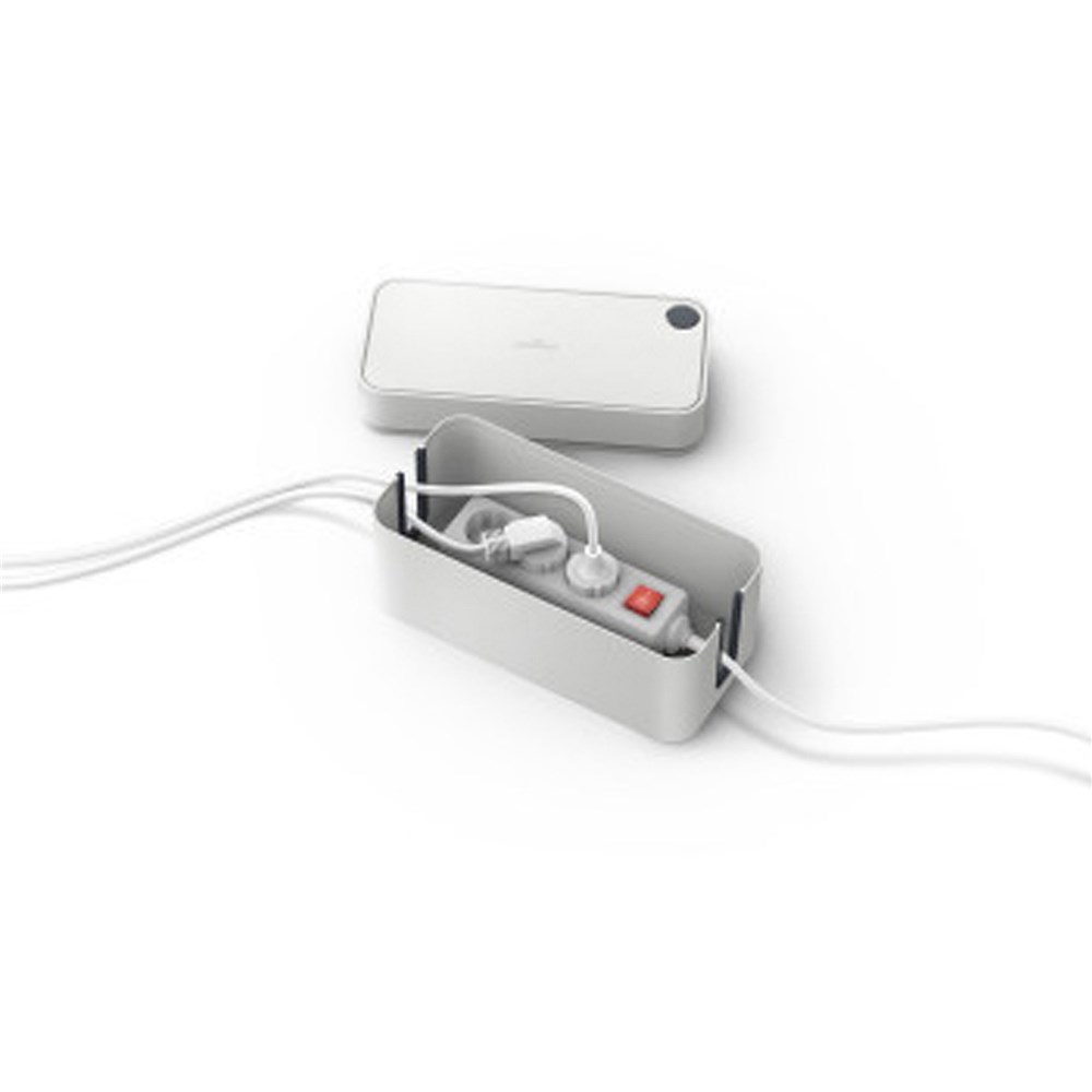 Elegant cable box to hold cables and 3-socket strip Double-sided rubberised cable outlet slots for easy handling and ideal air circulation Cover with practical, circular cable opening for mobile phone charging cable High-quality, flame-retardant plastic Large rubber pads for non-slip stability Dimensions: 246W x 238D x 116mmH.