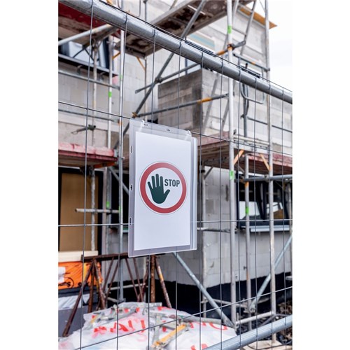 Water resistant, cable tie pockets for displaying notices or signs. The water proof pressure closure protects the contents against rain, humidity and dirt. Tested to IPX5 standards (can resist a sustained low pressure water jet spray). Can be used in portrait or landscape format. Anti-reflective.