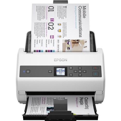 Sheet Feed, one pass duplex A4 colour scanner. Up to 65 ppm/130 ipm; single-pass duplex scanning. High-volume batch scanning - a 100-page Automatic Document Feeder handles even the biggest jobs, offers a peak daily duty cycle of up to 9000 sheets. Includes TWAIN and ISIS drivers for easy integration with existing software; PC and Mac compatible. Colour LCD display and convenient buttons offer easy access to user-defined jobs, settings, modes and maintenance. Scan mixed stacks of business and ID cards, single sheets, long documents, and folded pages up to 11' x 17' (carrier sheet required for folded oversized pages, sold separately). Includes a Slow Speed Mode for delicate sheets; Double-feed Detection and Paper Protection prevent misfeeds. Powerful and compact desktop scanner easily fits within virtually any workspace. Includes Epson Document Capture software to create searchable PDFs, or scan to online storage accounts like Evernote, SharePoint and Google Drive. Optional Flatbed Dock to connect to a compatible Epson photo scanner for scanning photos, passports, or bound materials (both sold separately). 1 Year Manufacturer's Warranty.