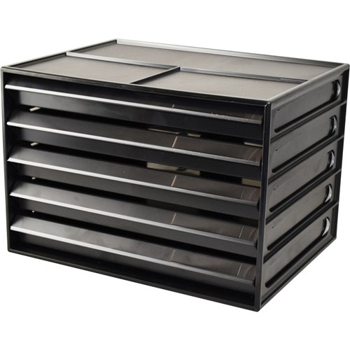 5 drawer space saving landscape design. Convenient finger holes for easy removal of paper & documents. Stackable to create a modular filing system. 100% Australian made. L255xW330xH230mm. GECA (Good Environmental Choice Australia) certified.