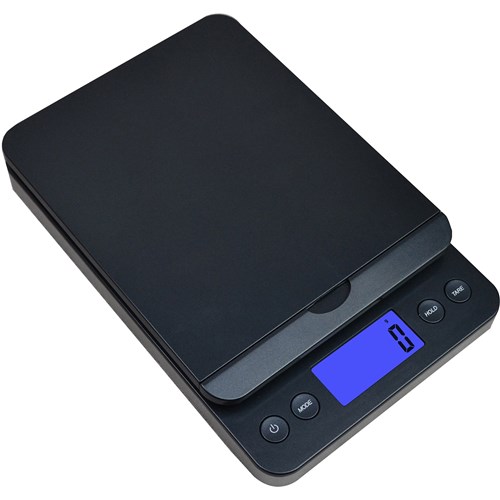 Weighs in grams, ounces, pounds and kilograms Weight Hold and Tare functions Digital display with blue backlit light Measures in 5 gram increments Comes complete with batteries and AC adaptor Rubber foot pads for added stability