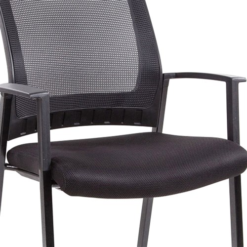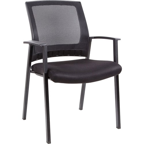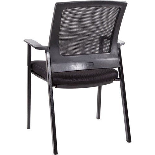 Weight Rating: 150kg. Chair Dimension: Seat Width 505mm, Seat Depth 450mm, Back Height: 460mm. Unit Weight: 9Kg. Upholstered Seat in Black Fabric and Solid, Flat PU Arms. Excellent posture correct lumbar. Robust Black Powder Coated Metal Frame. Stackable to up to 4 high. Perfectly designed for Aged Care, Education, Reception and Visitor Seating and Break-Out Zones. With Mesh Contoured Back rest that provides great Support. 7 Years Manufacturer's Warranty. Delivery, installation and assembly charges may apply to furniture. Please enquire to confirm.