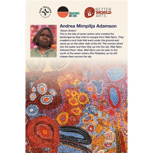 A unique commercial fabrics designed by Andrea Adamson (Indigenous Artist) combined with K2 Commercial PU Leather. Weight rating: 120kg. Indicated seat hours: 12 hours. Dimensions: 450 Diameter x 450mmH. Heavy duty commercial chair with 3 lever mechanism and ratchet back height adjustment. Concealed feet. Fire retardant contoured moulded foam. Available in different size on request. Product image for reference only. Design pattern may differ as a result of variations in the art work. 5 Years Manufacturer's Warranty. Delivery, installation and assembly charges may apply to furniture. Please enquire to confirm.