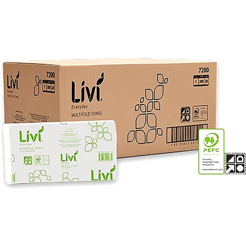 Livi 7200 Everyday Hand Towel Multifold 1 Ply 200 Sheets Box of 20 230w x 240L 7200 5506 Dispenser. A quality soft and absorbent hand towel for effective hand drying. Designed to be dispensed one sheet at a time, helping to reduce waste and improve hygiene in public spaces. 100% sustainable virgin fibre that is independently certified annually by PEFC. To suit Livi hand towel dispenser 5506.