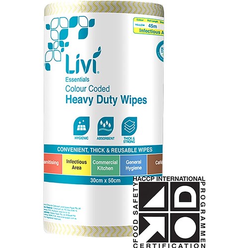Avoid cross contamination with colour coded wipes which are heavy duty and can be washed and tumble dried up to 5 times. Recommended Use: Yellow, with an antibacterial finish, is suitable for infection control. HACCP certified, each non woven wipe is 70 grams per square metre making them thick and strong for extra absorbent results. Carton of 4 rolls.