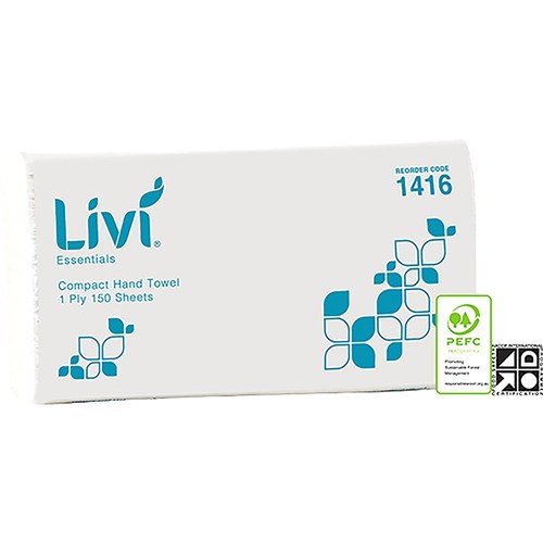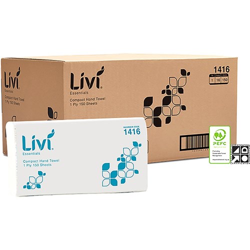Livi Essentials Hand Towel Compact 1 Ply 150 Sheet Box of 16 200w x 250mmL 1416 5507 Dispenser
