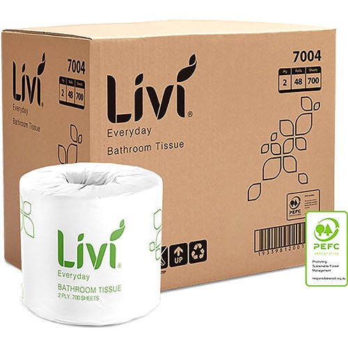 A practical solution for a busy bathroom with the soft 2 ply paper bonded for dependability and comfort, with 700 sheets to minimise refills and run out. Each roll is wrapped in stylish individual packing for improved hygiene and presentation. 100% sustainable virgin fibre that is independently certified annually by PEFC. To suit Livi toilet dispenser 5500, 5501 and 5502.