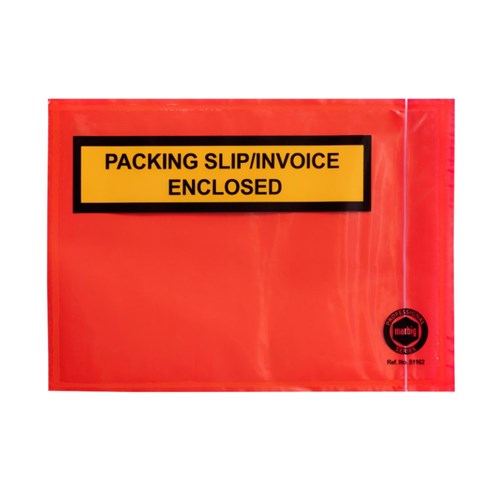 Self Adhesive superior grade adhesive and polyethylene prevent crinkling and sticking to itself. Larger size for multiple documents. Yellow and black print 'packing slip/ invoice'. Red background.