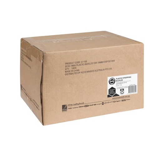 For use with 19mm wide polypropylene strapping. Carton of 1000 buckles. White plastic.