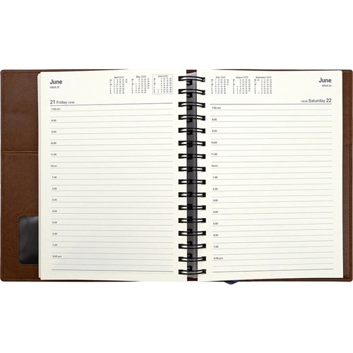 Flexible PVC cover management wiro diary, stitched edges and deluxe pocket inside the cover. Twin wiro allows you to lay the diary flat on your desk. Includes Australian and New Zealand holidays and school terms. Reference calendars. World holidays. 1 hour appointment times 7:00am - 8:00pm. Conversion table. International and National dialling codes. Weights and measures table. International paper sizes. Staff leave. Monthly expenses. Current planner.