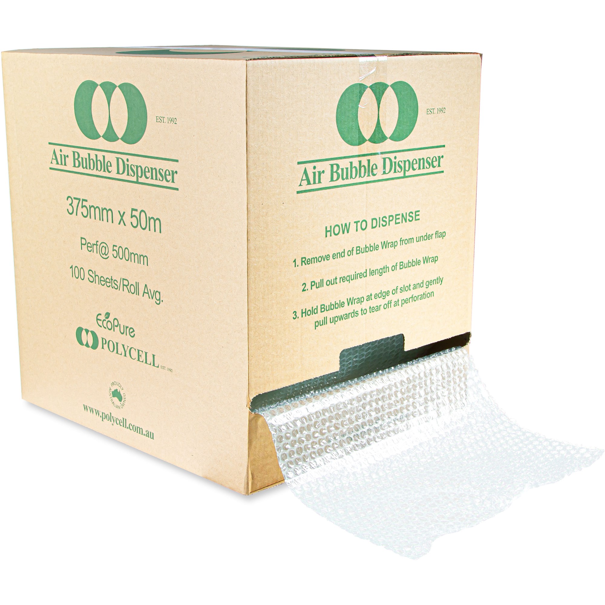 375mm wide x 50 metres long, perforated 500mm, Dispenser Box. Ecopure has a biodegrading agent added. Strong padded bubble protection. Suits light to medium cushioning. Made in Australia.