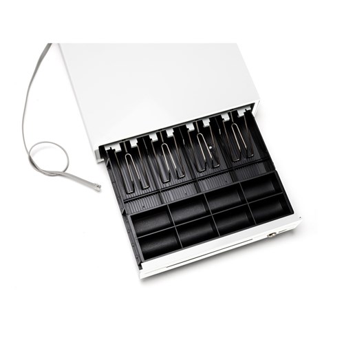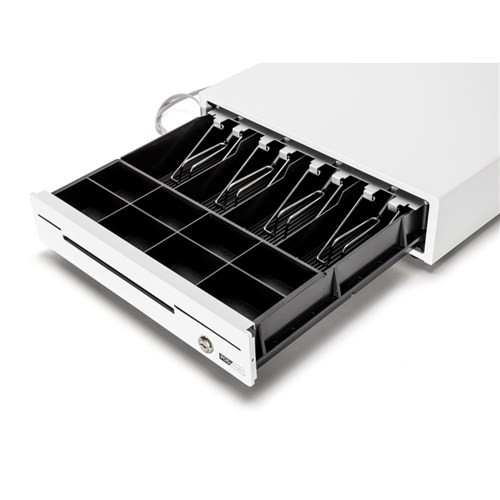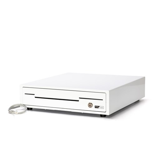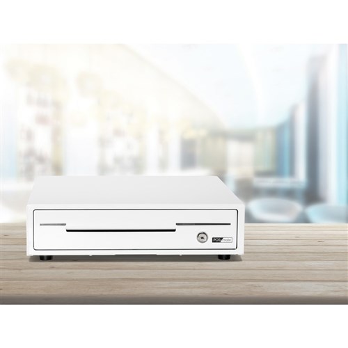 Works with 24v receipt printers. The cash drawer comes with a 1 metre cable to connect your receipt printer. There are 4 note holders, 8 coin trays and a cheque slot for organising currency. It has a durable steel casing. There is a 3-position lock for added security, with 2 keys included. It is colour matched with under counter brackets. The dimensions are 330W x 360D x 90mmH with 80mm cash drawer and 10 mm feet. The cash drawer is a gloss white colour. 1 Year Manufacturer's Warranty.