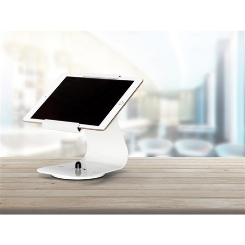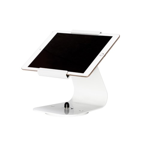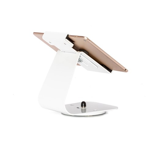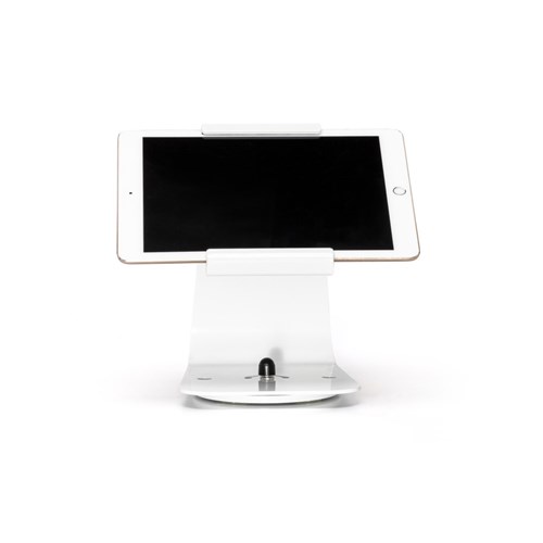 This stand is compatible with all iPads and tablets that have a width of 148 mm to 183 mm. It can be secured using 2 screws. If remaining portable, the silicone foot keeps it non-slip on countertops. It attaches magnetically to cash drawers. It's constructed from solid steel. The 180 degree swivel base allows you to rotate it without needing to lift or remove the tablet from the stand. The silicone keeps your tablet screen free from scratches, scuffs and dirt. The compact design comes in Gloss White. 1 Year Manufacturer's Warranty. Tablet is NOT included - Stand Only.