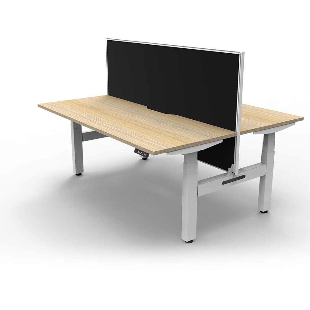 The entire Boost+ range has now been performance tested and is compliant to the AFRDI standards for general safety, strength, durability and stability in all sizes and configurations based on AS/NZS 4442:201. Unit Dimension: 1500mm W x 1500mm D x 1330mm H (Overall). Per User: 1500mm W x 750mm D. Desk Height: 620-1270mm H. Includes pinnable privacy screen in black fabric with matching white powder coated frame. 900mm H x 30mm T. Smooth and quiet adjustment at 38mm per second. Min Digital control panel with 3 pre-set positions, LED display panel, keypad safety lock and reminder alarm setting. Natural Oak coloured worksurface with 750mm depth top. 50mm D scallop cut out to rear. Back to Back Workstation with Screen. Dual Motor 3 stage motorised legs. 140kg weight loading capacity. 10 Year Manufacturer's Warranty.