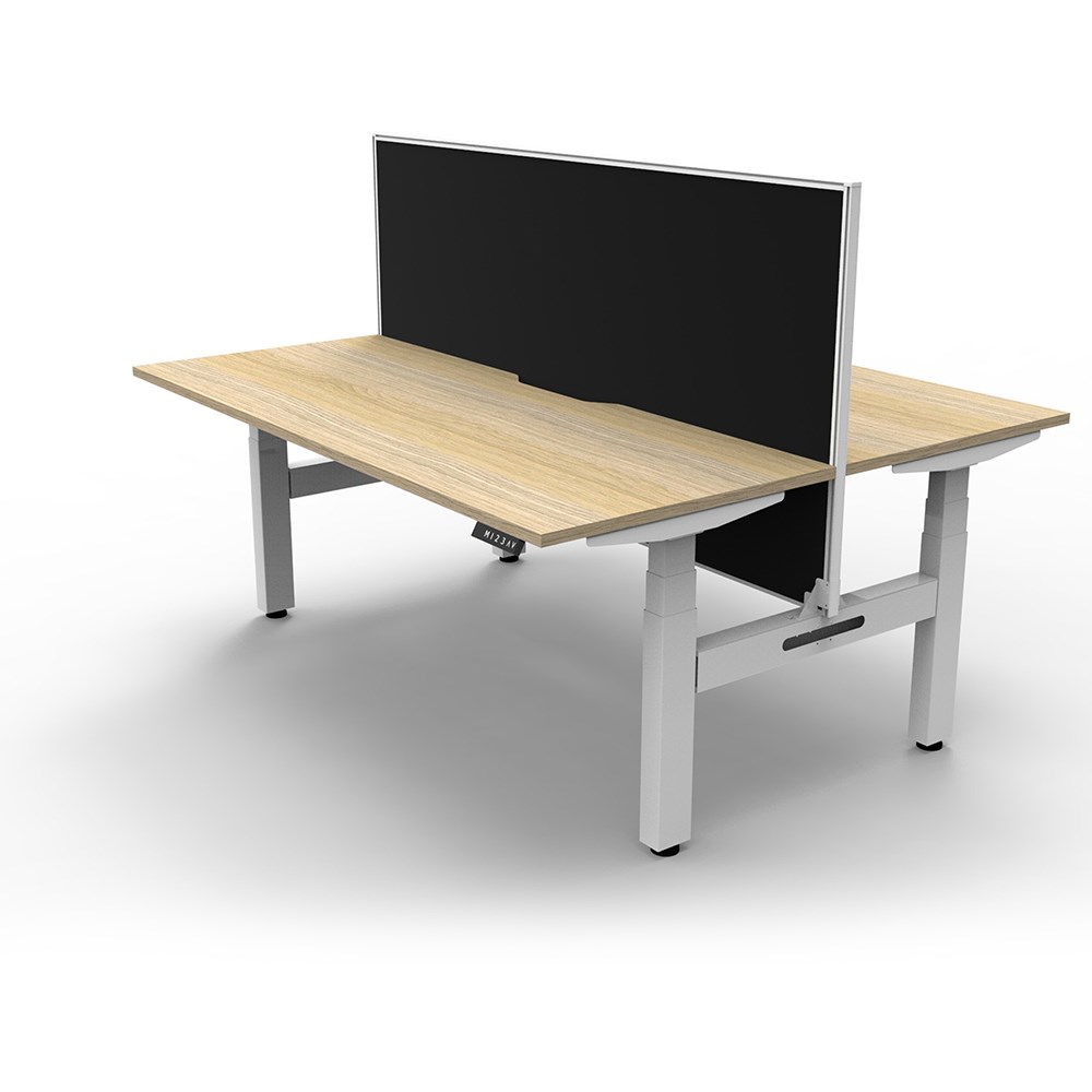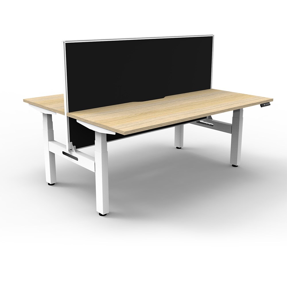 The entire Boost+ range has now been performance tested and is compliant to the AFRDI standards for general safety, strength, durability and stability in all sizes and configurations based on AS/NZS 4442:201. Unit Dimension: 1800mm W x 1500mm D x 1330mm H (Overall). Per User: 1800mm W x 750mm D. Desk Height: 620-1270mm H. Includes pinnable privacy screen in black fabric with matching white powder coated frame. 900mm H x 30mm T. Smooth and quiet adjustment at 38mm per second. Min Digital control panel with 3 pre-set positions, LED display panel, keypad safety lock and reminder alarm setting. Natural Oak coloured worksurface with 750mm depth top. 50mm D scallop cut out to rear. Back to Back Workstation with Screen. Dual Motor 3 stage motorised legs. 140kg weight loading capacity. 10 Year Manufacturer's Warranty.