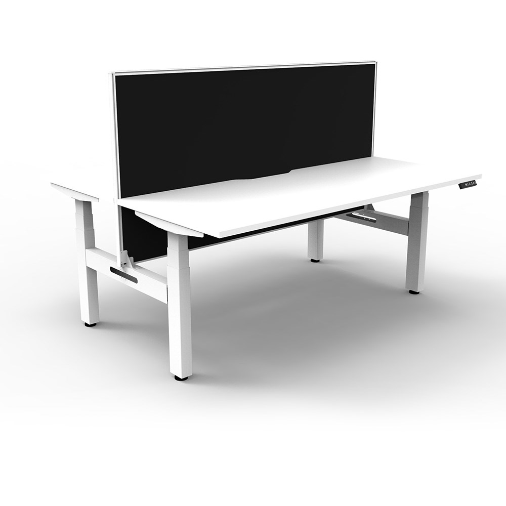 The entire Boost+ range has now been performance tested and is compliant to the AFRDI standards for general safety, strength, durability and stability in all sizes and configurations based on AS/NZS 4442:201. Unit Dimension: 1800mm W x 1500mm D x 1330mm H (Overall). Per User: 1800mm W x 750mm D. Desk Height: 620-1270mm H. Includes pinnable privacy screen in black fabric with matching white powder coated frame. 900mm H x 30mm T. Smooth and quiet adjustment at 38mm per second. Min Digital control panel with 3 pre-set positions, LED display panel, keypad safety lock and reminder alarm setting. Natural White coloured worksurface with 750mm depth top. 50mm D scallop cut out to rear. Back to Back Workstation with Screen. Dual Motor 3 stage motorised legs. 140kg weight loading capacity. 10 Year Manufacturer's Warranty.
