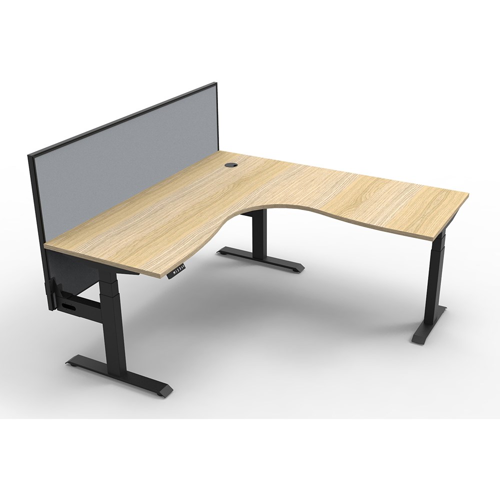 The entire Boost+ range has now been performance tested and is compliant to the AFRDI standards for general safety, strength, durability and stability in all sizes and configurations based on AS/NZS 4442:201. Unit Dimension:1800mm W x 1500mm W x 750mm D x 620mm - 1270mm H. Includes pinnable privacy screen in grey fabric with matching black powder coated frame. 900mm H x 30mm T. Smooth and quiet adjustment at 38mm per second. Min Digital control panel with 3 pre-set positions, LED display panel, keypad safety lock and reminder alarm setting. Natural Oak coloured worksurface with 750mm depth top. 50mm D scallop cut out to rear. Dual Motor 3 stage motorised legs. Corner Workstation with Screen. 140kg weight loading capacity. 10 Year Manufacturer's Warranty.