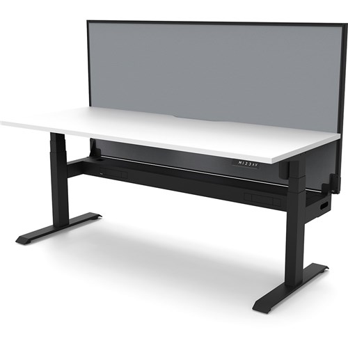 White top with Black frame. Unit Dimension: 1500mm W x 750mm D x 1330mm H. 620-1270mm height range for desk. E0 rated top. Powdercoat base. Digital control panel with 3 pre-set positions, LED display panel, keypad safety lock & reminder alarm setting. Anti-collision technology, noise emission of less than 50DB. Lifting capacity of 80kg with a max speed of 25mm per second. 700mm wide foot size with adjustable leveling feet. Comes with 30mm thick privacy screens and cable tray for cable management. 10 Year Manufacturer's Warranty. Delivery, installation and assembly charges may apply to furniture. Please enquire to confirm.